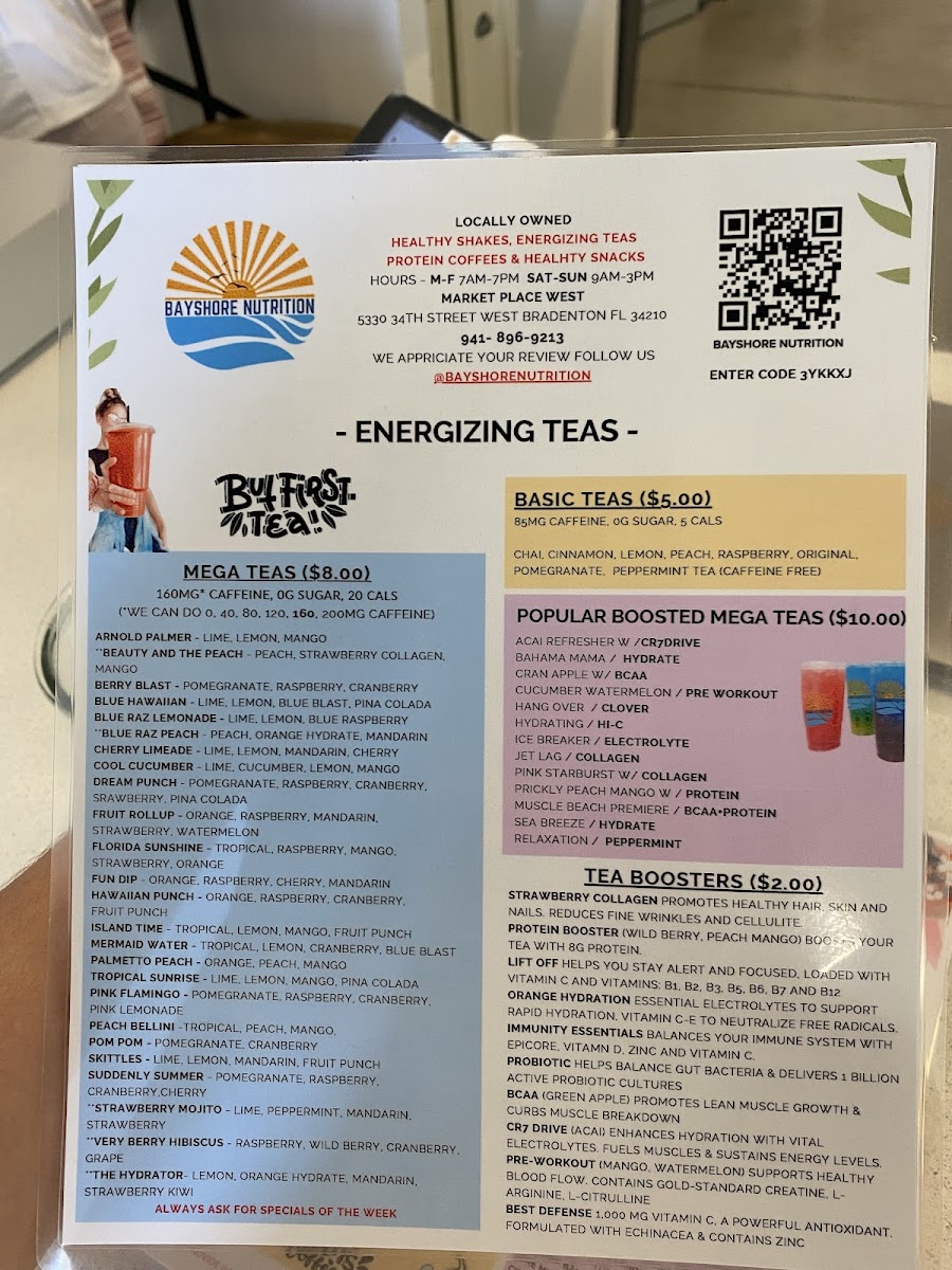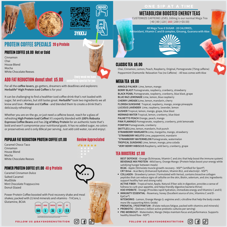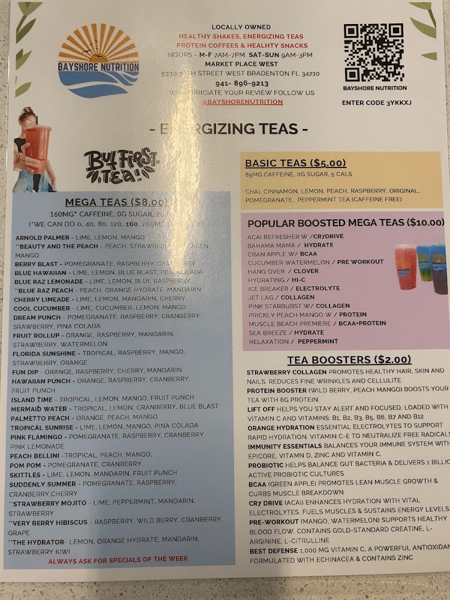 Nestled in the heart of Bradenton, FL, BAYSHORE NUTRITION offers a vibrant array of health-focused teas and shakes perfect for those seeking nutritious alternatives. Their MEGA TEAS are a must-try, featuring invigorating flavors like Lemon Herbal Tea and Tropical Lift Off, enhanced with energizing boosters for a refreshing twist. For protein lovers, the PB LOVERS SHAKES are a delightful treat, each boasting 30 grams of protein while remaining low in calories and sugar. Options include PB Oreo and Butterfinger shakes that satisfy sweet cravings without the guilt.